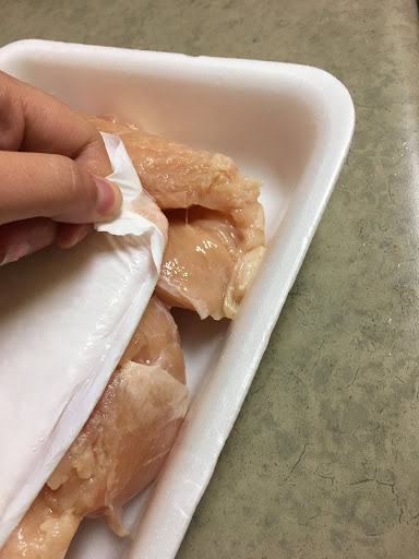 So, now, I am standing at the sink intently focused on defrosting this chicken. I am making the water temperature fluctuate between hot and cold. Chicken juices are flowing all over my hands and into the sink, and occasionally having to shift awkwardly as my roommate needs to access the water. The package wrapper has been ripped off and sits on the other end of the counter, farthest away from said roommate. My roommate who is vegan.