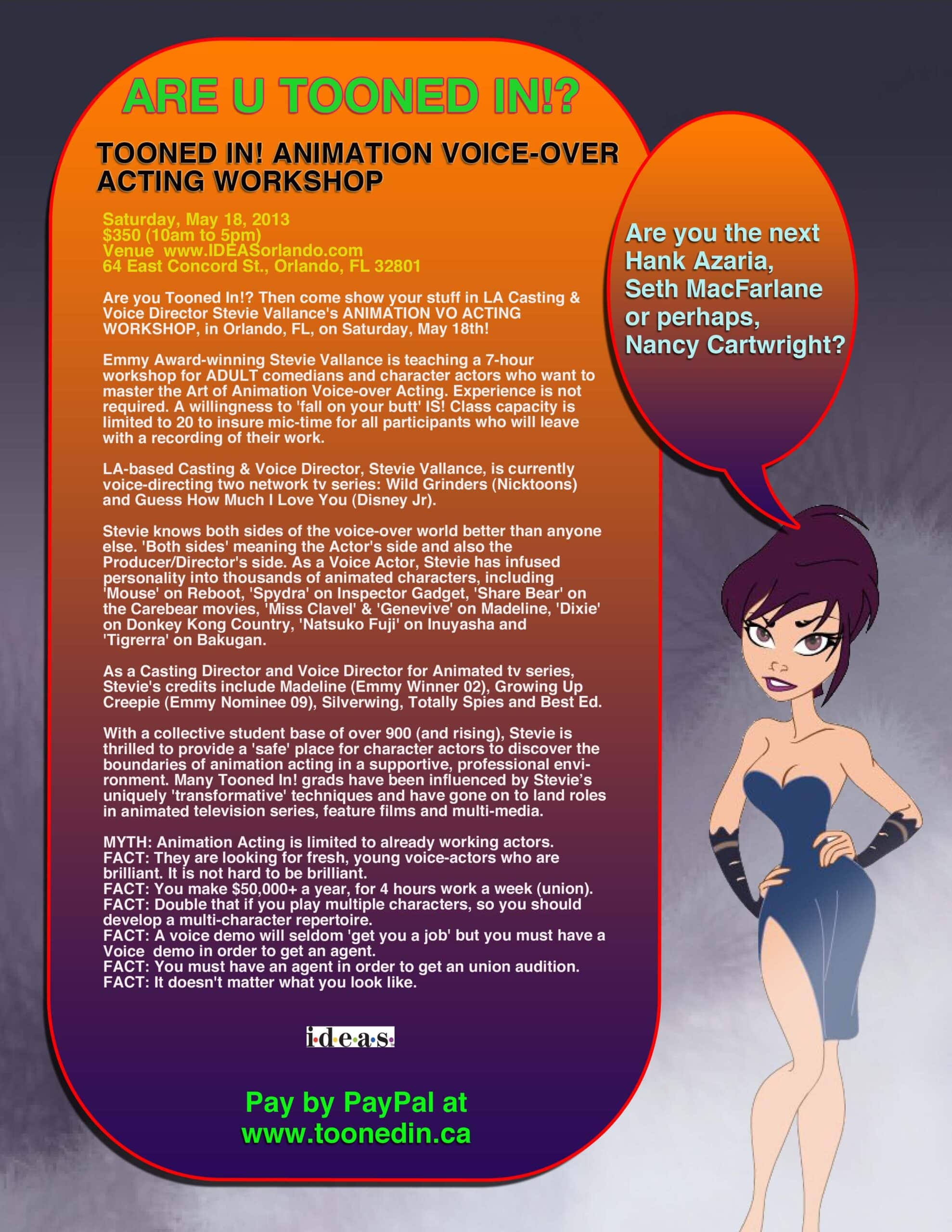 Emmy Award-winning Los Angeles-based casting and voice director Stevie Vallance will be teaching a 7-hour animation acting workshop at the downtown Orlando Studio of IDEAS from 10am - 5pm on Saturday May 18, 2013. The workshop is for adult comedians and character actors who want to master the art of animation...