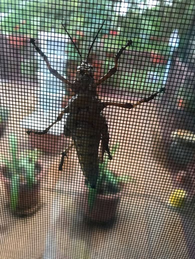 The second problem was lubbers. They are REAL monsters. Not the cucumber plants kind of monster (which did continue to grow), but huge grasshoppers…three inches long. They are about the grossest insect there is. And NOTHING short of chopping off their heads kills them. Not only can they leap tall buildings in a single bound (I’m sure of it), but they can fly! I have been petrified of them since childhood when we used to call them locusts. They were all over my yard and deck, and windows…as you can see here. I was real brave to take a closeup picture only because there was glass and a screen between me and that critter. There were hundreds of them. They ate almost all of the foliage off of my amaryllis plants, and pretty much anything else they wanted in my yard. I killed as many as I could with a shovel, but still, they persisted. They at most of the new growth on my pepper plants before I executed them. (Yep, the buddha in me just vacated for a while there.) I still see a few in my flower garden, no doubt finishing up on some of my other beloved plants, but the good news is that they only show up once a year. So, once they are gone, I will be good to plant lubber free in the fall.