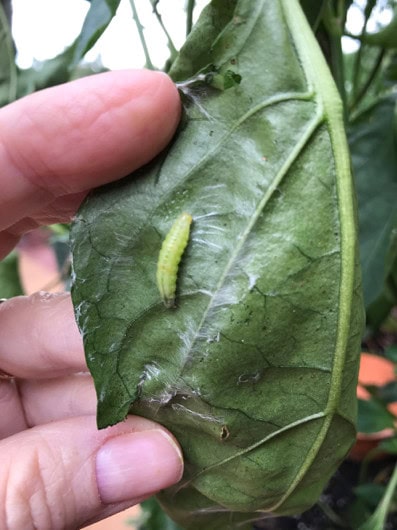The third problem was that the leaves on my pepper plants were curling up. At first, I thought it was just the heat or lack of water, but then I noticed some of the leaves were actually folded back. When I unfolded it, I found this little worm, no doubt the larva stage of some nasty something or other. I found three such critters, and since I want to stay organic, I just picked them off and squished them with my foot…with shoes on, of course! I sprayed with neem oil again, and hopefully, I will be rid of anything that continues to haunt my poor peppers. There is new growth beginning to show up and I have more baby peppers, too, so hopefully, this will take care of it.