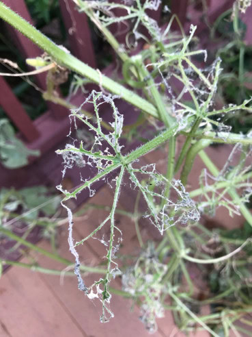 The fourth problem was that the cucumber plants continued to grow…and grow…and grow. The vines were so long that we couldn’t sweep the deck off. So, I decided I would just turn the whole tower toward the deck rail and droop them over the deck. Well, that worked for a few days, and then…I noticed SOMETHING was eating the leaves. I mean completely. Not sure what these are, but whatever they are, they are hungry, and they love cucumber leaves. They don’t seem to like the cucumbers, per se, as now I can see that I have two almost full grown and several more little, tiny ones. As you can see, it was a pretty devastating hit. I can’t see any worms, but do notice many, many ants! Hmmm…while I don’t know what “this” is, I am hoping that the neem oil will help. Neem oil is good for what ails most plants, it seems, so I will be using it more diligently from now on.