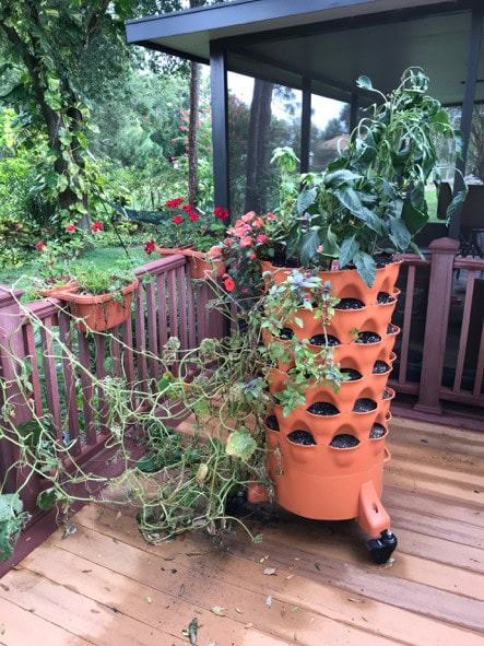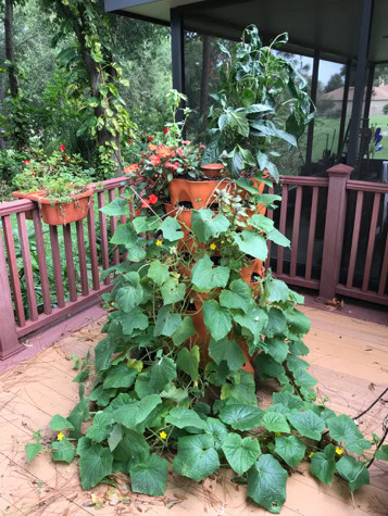 So here is my tower today with the poor, drooping cucumber vines that hang over my deck railing. Most of the plants in the tower can be seen. It is producing, although not optimally. I won’t plant again until late September or early October, and I will likely start with seeds to see how that will go. I have some lovely lettuce seeds (all kinds) and all the other seeds I bought several months ago that will still be viable. I’m hoping to continue to learn and be able to make this a more fruitful garden (see what I did there?) with all my favorite veggies. Thanks for going on my journey with me. When I have some new learnings, I will share again. Meanwhile, happy gardening!