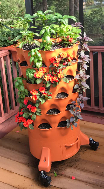 In multiple trips to several different nurseries, I found the plants to “learn” with. I got pepper plants and the two kinds of basil. No cukes yet, but I would keep looking. Oh, and I bought some flowering plants that I can’t eat, too. Why? Well, the Garden Tower Project website recommends that because most vegetable plants don’t really have enough flowers to attract bees and other pollinating insects, and if the blossoms aren’t pollinated, you get no vegetables. Plus, it just makes the tower look so much prettier!