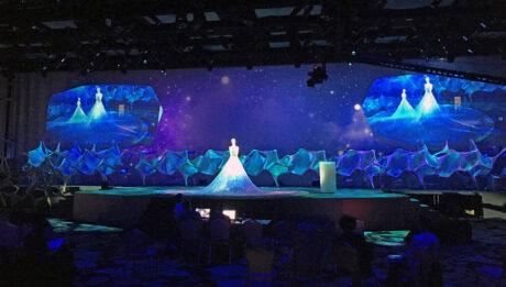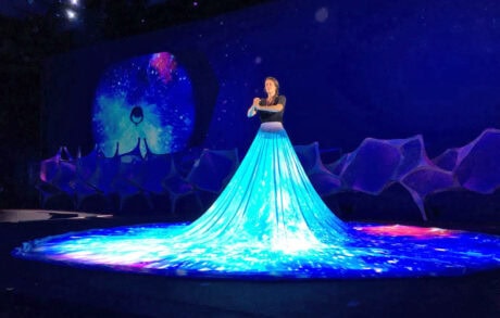 In addition to media production, IDEAS developed and oversaw the production of an artistic digital projection mapping performance on the main stage during the closing ceremonies. This required precise 3D modeling to determine projection parameters onto a custom 20ft diameter fabric screen flowing down from a dress worn by the vocalist center stage and out around her while CGI imagery was projected onto the circular splayed fabric. IDEAS’ onsite team ensured all last-minute adjustments were completed in time for the stunning closing that impressed the client and amazed the audience which included the Jordanian Royal Family and scientific dignitaries from around the world.