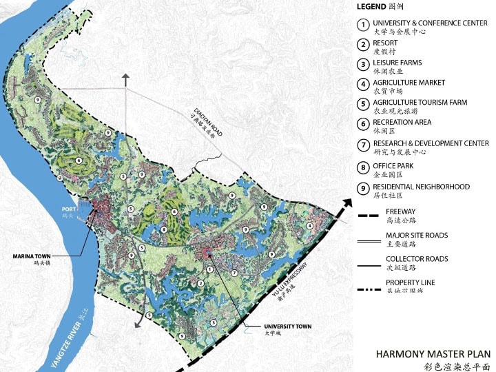 CHIC’s new “Eco-Town”, (English name: Harmony), is blessed with ten kilometers of riverfront along the Yangtze River, and 6,500 acres of hillside and gently rolling country. Harmony is an “exurb” where a new generation of residents will live, work and play with more space, fresher air, less crowded, and a greater sense of “exhale” and relaxation. This breath is accomplished while preserving their urban connections and amenities, along with the vitality of the thriving Chongqing spirit. With wellness, educational, residential, tourism, and business elements carefully integrated, Harmony is a lifestyle system, not a traditional land development.