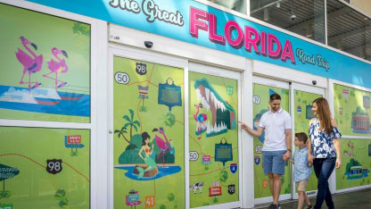 Old Florida’s nostalgic kitsch comes to life with cartoonish, postcard-style billboard depictions of beloved, iconic and vintage Florida destinations. These include the Everglades, St. Augustine, Daytona Beach and more.