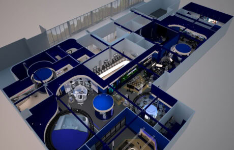 The project first took visitors on a tour of the company’s diverse innovation and product development areas. At each demonstration space, a vertical triangular truss tower (aka “trylon”) anchored the tour route with program ID information and an interactive touch screen.