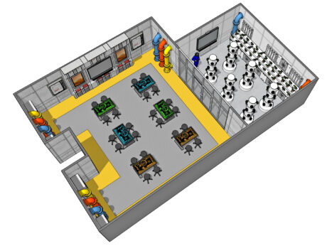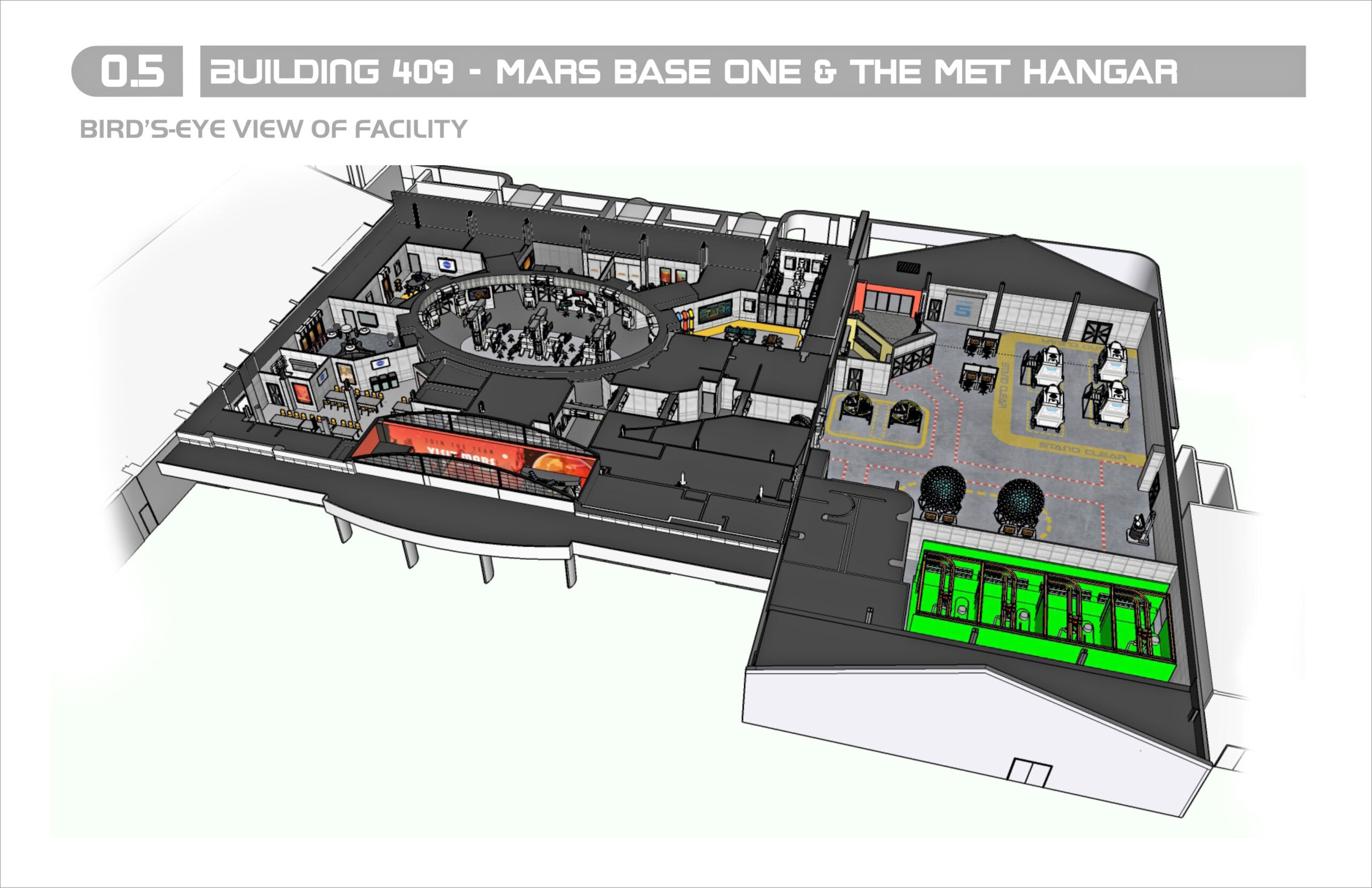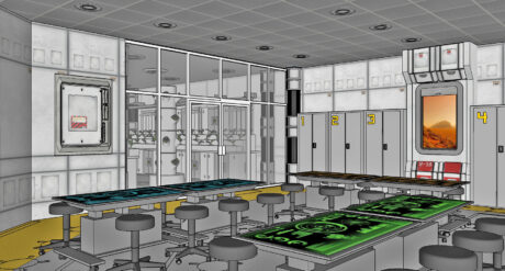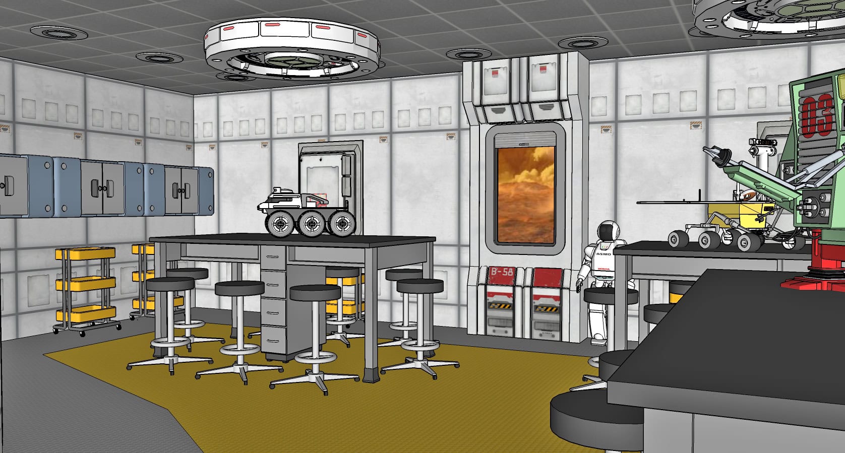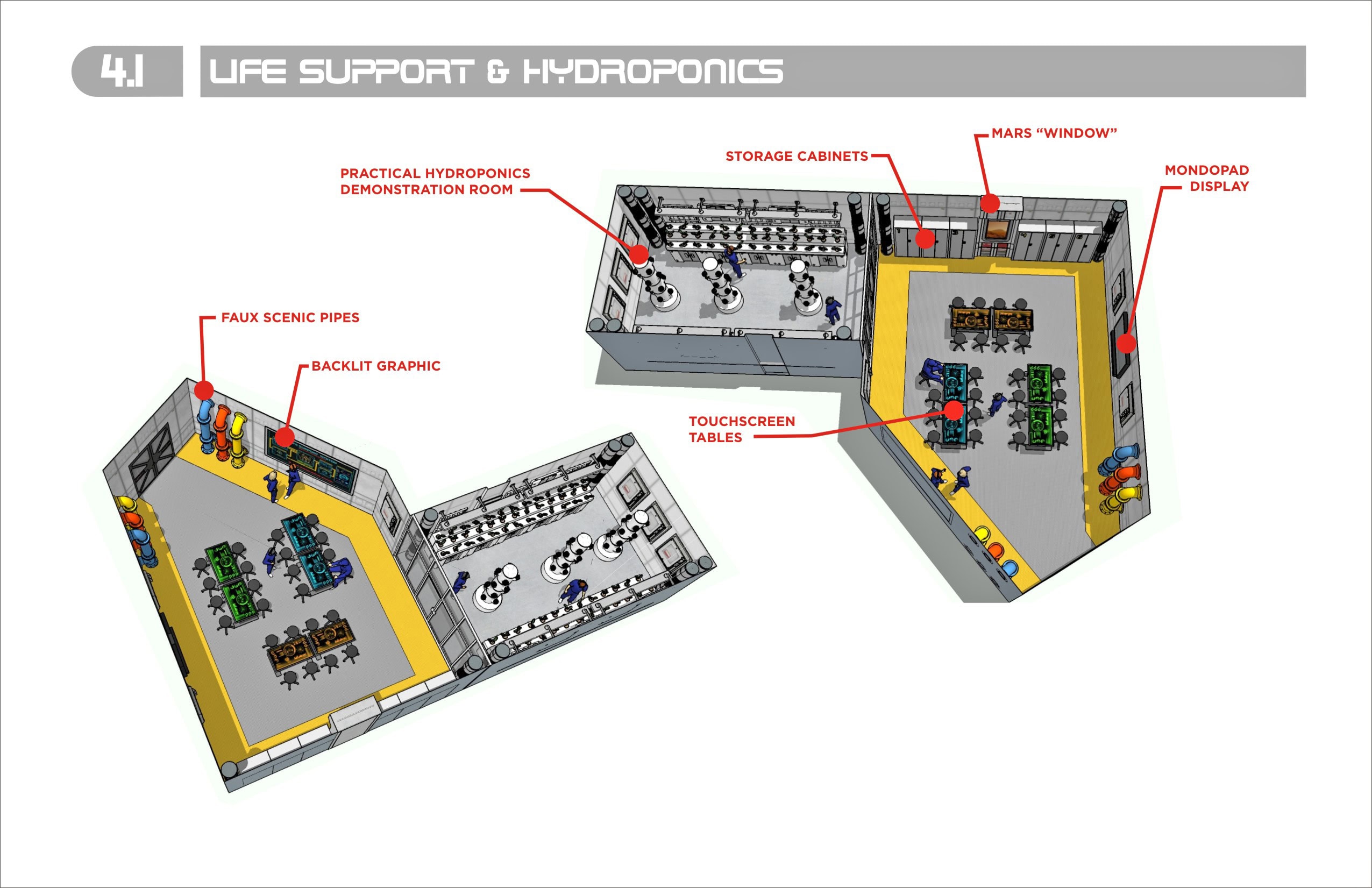 To deliver the slate of new STEM education concepts populated with believable mission challenges that would be encountered in an off-world environment, the IDEAS team completed a comprehensive conceptual design program for a renovated 27,000 SF building at the Kennedy Space Center Visitor Facility. This included arrival, queuing, and transition spaces; airlock entry portal; operations center; life support, engineering, and bio sciences/medical labs; crew quarters; and a large hangar deck with a variety of simulator platforms and systems to allow participants to rehearse surface excursions.